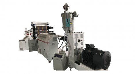 單螺桿擠出機-三輥壓延機-冷卻托架-裁邊-牽引-橫向切割機-落料臺或收卷