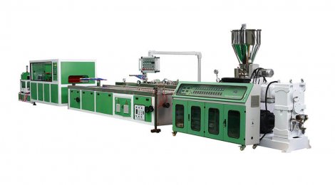 錐形雙螺桿擠出機--真空定型平臺--牽引機--切割機--落料架